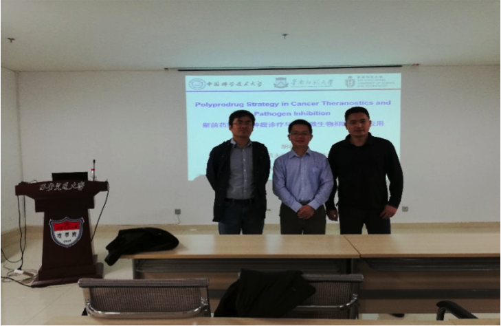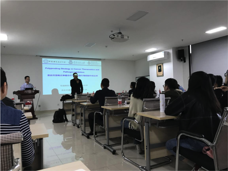 胡祥龙博士应邀为广大师生做了题为《聚前药策略在肿瘤诊疗与病原微生物抑制中的应用》的报告。胡博士讲述了“两亲性聚合物前药”的概念,详细阐述了其生物效应;并结合自己的研究进展阐述了其在生物医药等领域的应用。