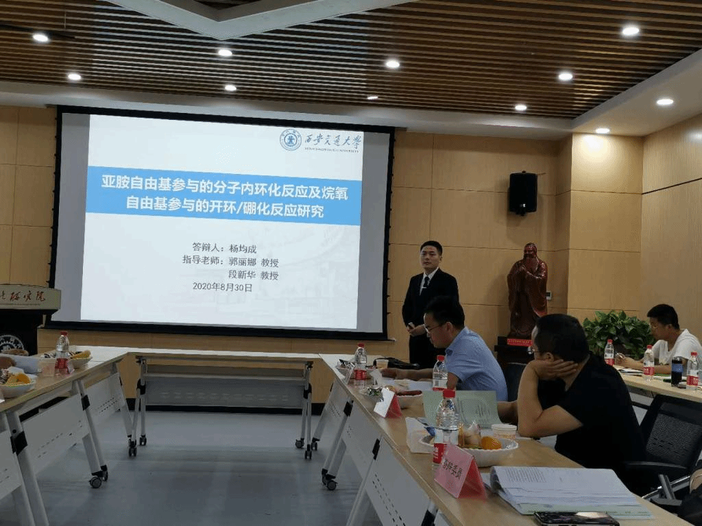 2020年8月30日下午,有机与高分子研究所(有机合成课题组)2020届博士研究生杨均成的学位论文答辩会在创新港19号巨构2105会议室举行。答辩委员会成员有李鹏飞教授、何炜教授(空军军医大学)、杨俊教授(陕西师范大学)、郭武生教授和徐四龙教授。