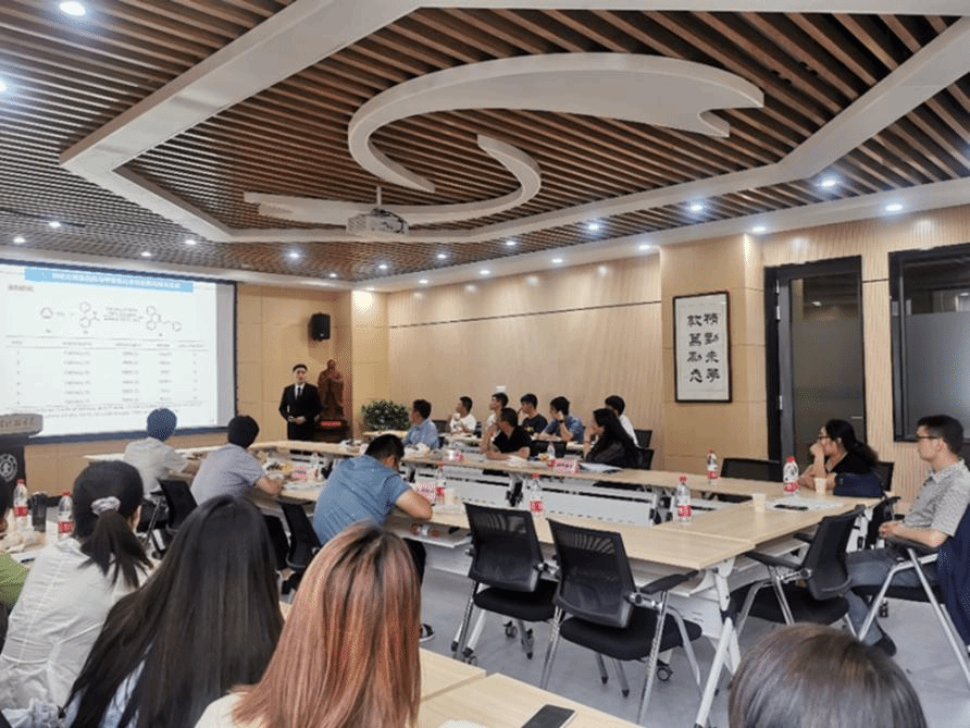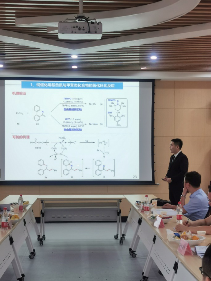 研究生学位论文答辩程序有序进行。答辩开始后,委员会认真听取了博士学位申请人杨均成题为“亚胺自由基参与的分子内环化反应及烷氧自由基参与的开环/硼化反应研究”的答辩陈述。随后,针对其答辩过程中所显示的问题及毕业论文中的细节,答辩委员们依次进行了细致提问。例如,针对课题一中产率偏低的问题,郭武生教授提出温度变化可能对产率影响很大,并用本课题组的实例让在座师生有更加真切的体会。杨俊教授针对氧化还原活性酯和环烷基过氧硅醚的相关性质进行了提问,答辩人尽自己所能对各问题进行细致解答,充分体现了其攻读博士期间在相关领域的积累和沉淀。何炜教授不仅针对论文中测定量子产率的具体原理和步骤提出了问题,还对毕业论文中的诸多细节提出了改进意见,使答辩人受益良多。徐四龙教授针对答辩人所研究的自由基领域中关于自由基选择性、种类等原理问题进行了提问,并对反应机理中的具体步骤提出了新的见解,十分引人深思。最后,答辩主席李鹏飞教授对答辩人的毕业论文进行了整体点评,并对以后反应设计等问题提出了中肯建议。