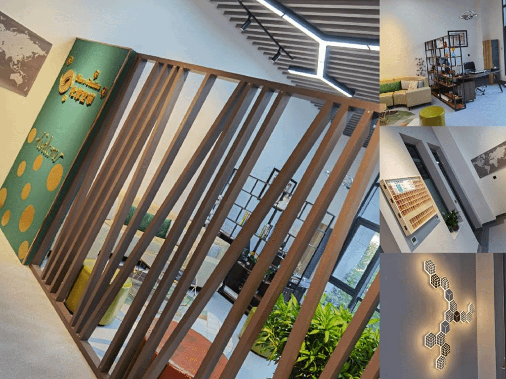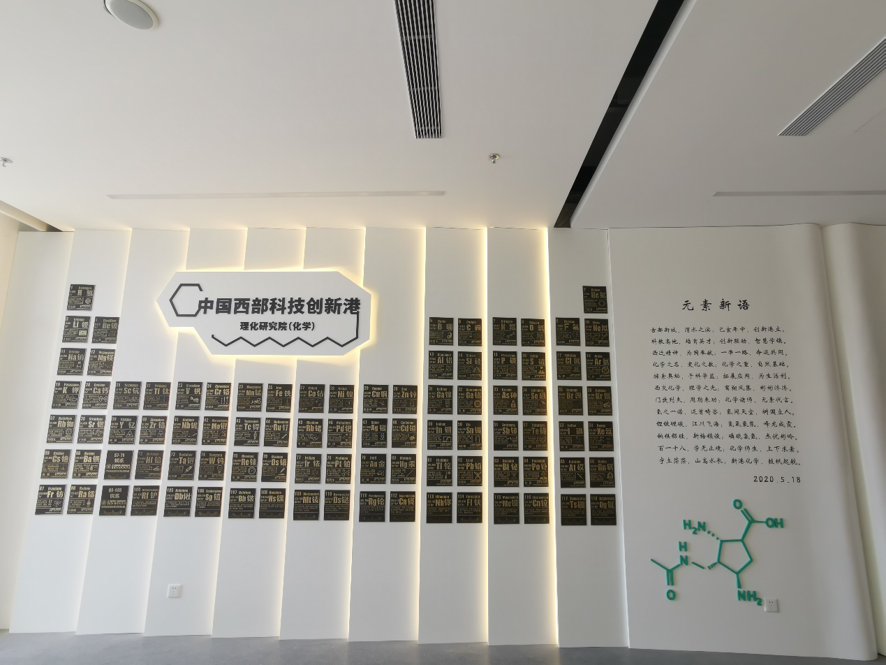 在一楼的化学空间是创新港十大网红打卡地之一。将化学元素融入空间的每一处角落。吊顶的元素灯。绘制的化学结构墙,包含真正元素的周期表。书架上摆满了化学家和化学史的书籍。这里也是“迷你花园”。各种绿植和鲜花环绕,在科研学习之余,同学们能够在此歇息,冲一杯咖啡,和三五好友聊天,品鉴不同寻常的化学生活。