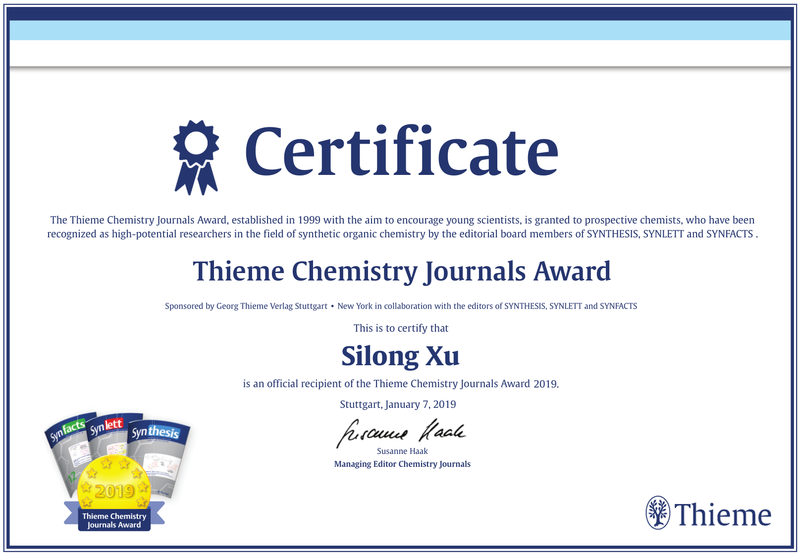 学院坚持四个面向,推进科技创新精神,紧密围绕创新港内涵建设,以抢占制高点、做增量为指导思想,着力加强“大团队、大平台、大项目、大成果”建设。化学学科在科学研究方面瞄准有机与金属有机材料化学、纳米催化与新能源材料化学、生物应用功能材料、先进功能高分子合成化学与物理等领域,不断探索理医交叉、理工交叉,既重视基础研究,又广泛开展应用研究。“十三五”期间,共发表高水平SCI论文500余篇,影响因子大于10的论文20余篇,专业顶级期刊论文13篇,ESI高被引论文31篇。申请发明专利50余项,已获授权发明专利30项。科研获奖也获得了突破,获得教育部科技进步一等奖1项,陕西省科技进步二等奖2项,陕西省高等学校科学科技一等奖3项。丁书江、周桂江入选科睿唯安高被引科学家和爱思唯尔高被引学者,徐四龙获得了Thieme Chemistry Journals Award国际化学奖。获得国家自然科学基金数量趋于稳定,获批总数49项。加强校企合作,横向经费逐年增加,科研到款从2017年的650万元增加到2019年的2100万元,2020年有望突破3000万元。在高性能聚合物材料的制备、加工工艺、新能源材料以及电池回收等多方面实现了成果转化。此外,学院在近年来通过参加和举办国际会议、邀请国内外知名学者进行讲座交流等,显著提升了在国内外的影响力。