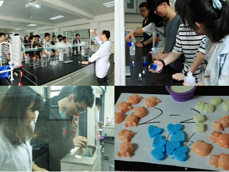 在实验体验区,解云川教授向同学们变了个魔术:水倒入杯子中为什么不见了?他通过“超能‘喝水’的材料”向同学们讲述高吸水树脂材料的合成机理、特点及应用,同学们通过在极少量的聚丙烯酸中加入大量的水,观察到其千倍吸水能力。朱敏老师带领同学们自制美丽香皂,通过将皂基溶解加热、上色、发泡、制模、冷却、脱模等过程体验香皂制作过程,学生们将制作好的各种颜色、各种形状的香皂带走,极大调动了同学们的参与积极性。