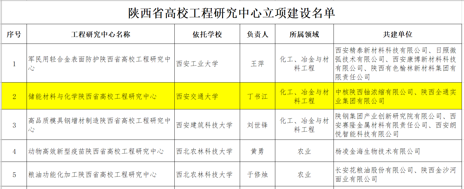 丁书江教授牵头申请的储能材料与化学陕西省高校工程研究中心经学校推荐,省教育厅组织专家评审,厅务会审议和网上公示,正式立项建设。