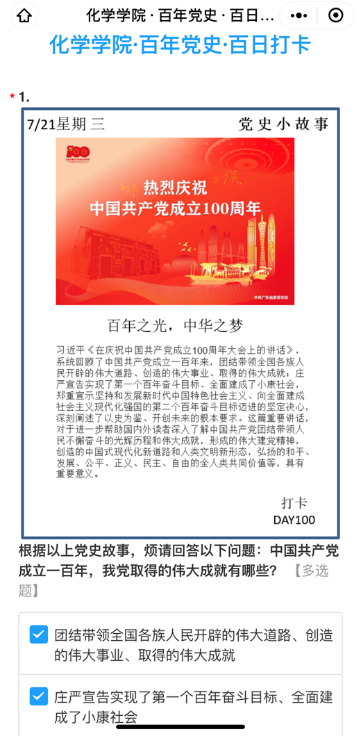 ·百年党史·百日学习”活动,利用微信小程序,每天发布党史图片和相关的党史知识,设计1-3道党史知识题,促使学院全体党员了解学习我党发展过程,各支部党员平均完成率达到95.6%。4月初,为学院全体党员制定特色化、差异化、追求实效的“三审四学”学习计划。即党员—支部书记审定,支部书记—党委审定,领导干部—党委书记审定。每名党员均制定包括“必须学”“重点学”“补充学”“拆分学”的学习计划。发放学习教育辅导用书,督导基层支部制定特色学习教育计划并组织党员进行集中和个人自学。6月底,学院开展了“我以西迁赋,敬党百年兴”活动,通过以“我是交大化学人,西迁精神有我传”为宣言,组织全体师生党员以团队、个人、支部等形式在学校各标志性建筑物前打卡朗诵西迁赋。传承西迁精神,做到学史明理、学史增信、学史崇德、学史力行,学党史、悟思想、办实事、开新局。7月初,学院面向全体师生党员、师生党支部开展“学党史、践承诺、见行动”主题活动并在学院设立各类集体和个人奖项。深挖学院师生中的先进典型,发挥示范引领作用。利用爱国主义教育基地等载体,多形式多批次组织开展爱国主义教育活动。5月10日,S0112团支部开展“学党史、强信念、跟党走”主题团日活动;5月15日,研究生干部赴照金开展“学党史、悟思想、办实事、开新局”主题学习实践活动;9月底,新生支部分别参观了交大西迁博物馆和香香漫画