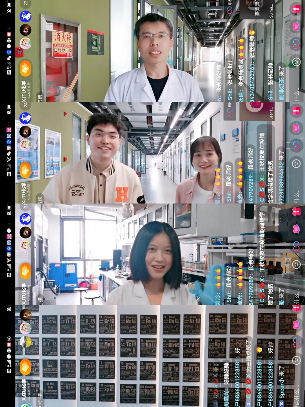 主持人李玉硕、费钰茜和摄像崔博带领大家回忆化学楼、樱花道、主楼教室、西迁纪念馆和康桥食堂,共忆青春校园。