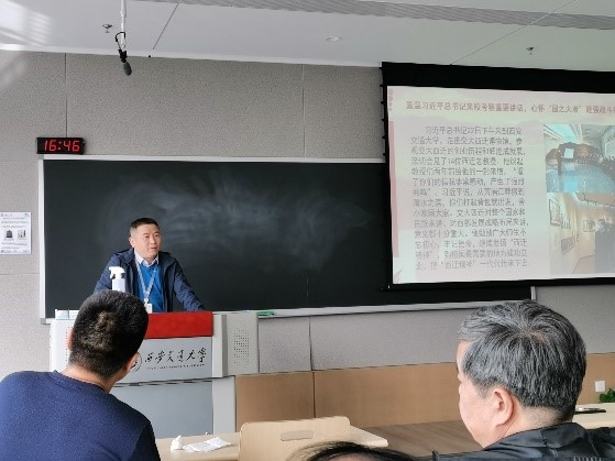 时的重要讲话精神,并讲述了当时总书记来视察时自己的亲身经历。张书记记述到,当大家得知总书记来校视察的消息时十分激动,但仍按照疫情防护要求排队欢迎总书记的到来。当时习总书记在与西迁老教授座谈之后,遇到了在冷风中等待的师生们,总书记也十分的激动,便即兴进行了五分钟的讲话,总书记的讲话虽是即兴的,但是有思想、有角度、有深度、有格局,为我们的发展和科研提供了方向和动力。会想到一年前总书记的讲话,张彦峰书记又谈到了一年前化学学科作为第一梯队搬入创新港,作为交大“二次西迁”的主力军,我们更应以西迁精神为支持站好自己的岗。
