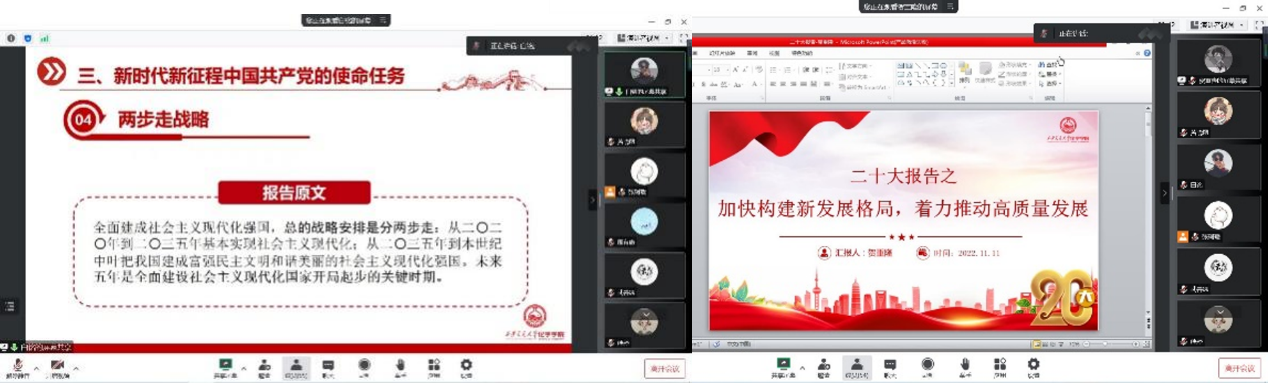 会议伊始,支部书记刘乐老师介绍了此次支部学习的背景和重大意义。随后,杨铭宇、白铭、贺重隆等15位同学分别结合自身科研背景、学习内容分别就二十大报告的十五个部分进行学习和分享。