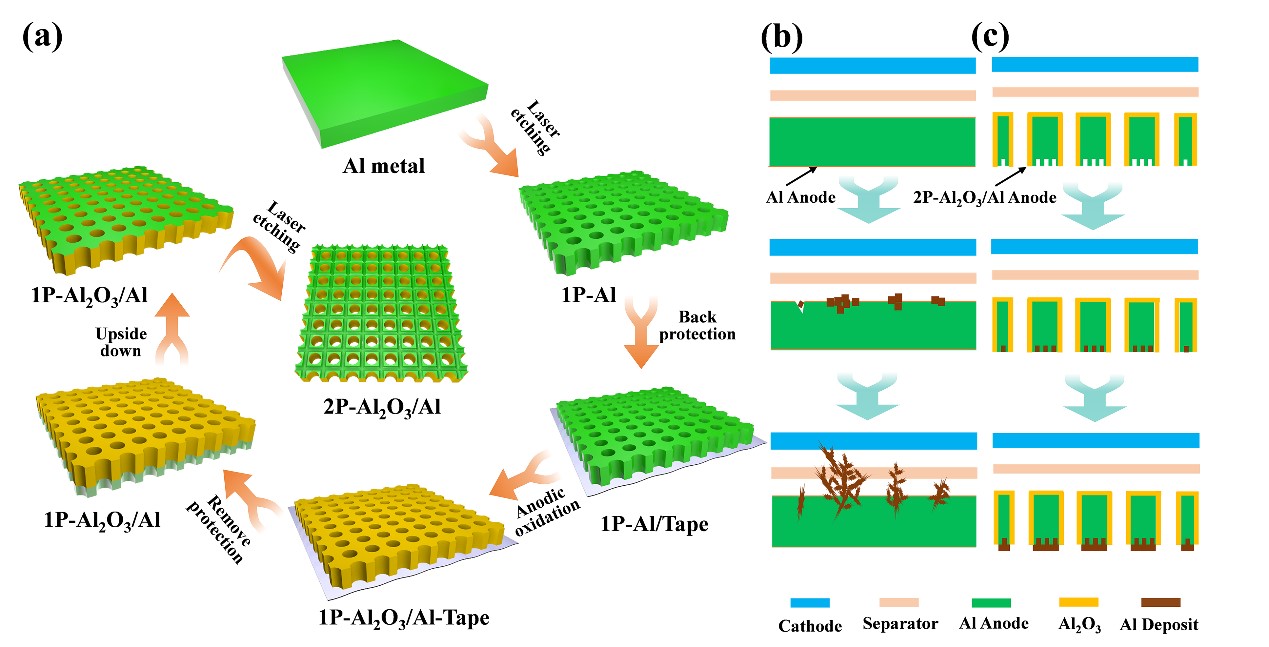近年来,全球能源系统已经由化石能源向可再生能源转化,而能源存储是可再生能源利用的关键。能源存储有多种方法来实现,而以电化学方式储存能量的电池是效率最高且能够大规模应用的一种方法。铝电池(AIB)因其低成本、高理论容量(理论体积比容量和质量比容量分别为8048 mAh·cm-3和2981 mAh·g-1)和高安全性(遇水和空气时不燃烧)而受到广泛关注。然而,由于金属阳极电池在充电过程中不受控制的表面形态、化学反应和流体动力学过程,枝晶的生长不可避免。最近的研究表明,3D金属阳极可以增加电极和电解质之间的有效接触面积,降低电极的局部电流密度,从而防止电极表面的腐蚀和枝晶生长。但由于较高的电场强度和较短的离子扩散路径,金属颗粒仍然倾向于优先沉积在电极的顶部区域。对于大面容量的铝电池系统,不可避免地会增加单位面积铝的沉积量。大量的铝沉积物会在正负电极之间架起桥梁,加剧枝晶生长,这将严重损害电池的长期稳定性和安全性。