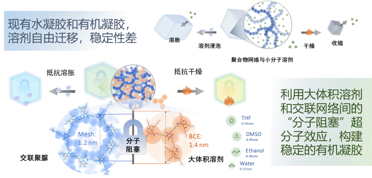 “智能高分子”团队的吴宥伸副教授和张彦峰教授,从机械互锁超分子原理中汲取灵感,提出了 “分子阻塞”超分子机制,利用溶剂分子与交联网状结构之间的尺寸差异带来的阻滞,有效抑制溶剂在凝胶内的迁移。