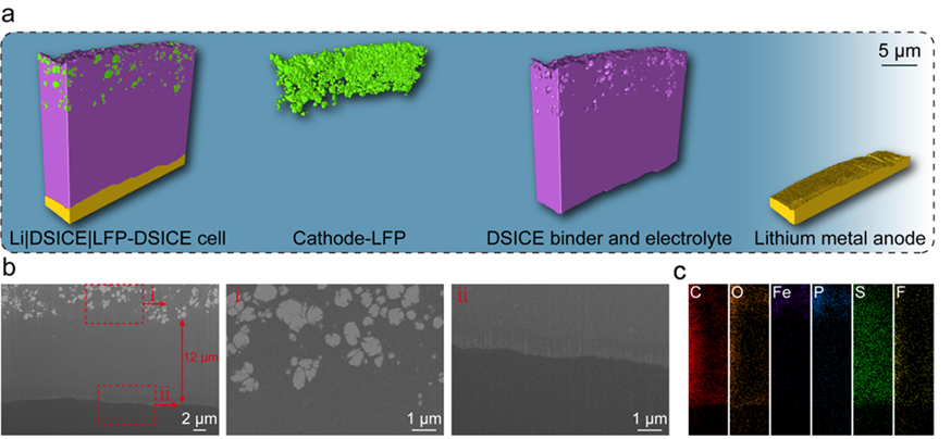 丁书江教授团队在前期设计的动态超分子离子导电弹性体(DSICE)材料基础上,发展了多重动态键驱动全固态锂电池正极/聚合物电解质一体化的新策略,构建了集成式正极/超薄聚合物电解质的全固态锂电池(图1)。