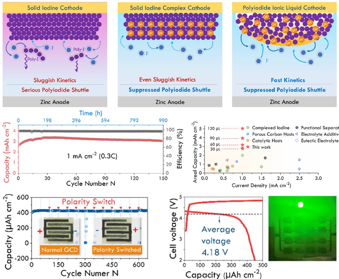 丁书江课题组开发了一种独特的碘化物离子液体作为锌离子电池正极材料,同时实现了碘正极的高面积容量和高循环稳定性。该离子液体正极材料由于其内部优异的传质传荷能力,使得其电导率比纯碘高了四个数量级。同时离子液体正极具有高度疏水的特征,大大降低了其穿梭效应。基于这些优异的性质,所组装的锌-碘电池展现出在3 mAh cm-2的高面积容量稳定循环超990小时,在高倍率下可以稳定循环超过4000次。另外基于该液态正极材料所设计制备的柔性电池,不仅可以通过电路设计实现高电压运行,也可以在独特的极性翻转模式下稳定循环。本研究工作为首次强调了卤素正极材料本征电导率对电池性质的影响,为锌离子电池实用化提供了有益的参考。