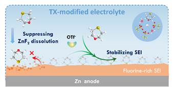 丁书江团队首次揭示了富氟SEI的溶解是造成界面不稳定的原因之一并提出抑制富氟SEI溶解的策略。在水系锌离子电池基底电解液中引入1,4-噻噁烷(TX)添加剂可减缓含氟组分(如ZnF2)的溶解并稳定富氟SEI层。一方面, TX调节水溶剂的极性,有效降低ZnF2的溶解度;另一方面,TX可以在电极/电解质界面形成较强的化学吸附并优化Zn2+溶剂化壳结构,降低局部水分子的活性,进一步阻止ZnF2溶解到电解质中,增强金属锌阳极的稳定性。作为概念验证,改性电解液制备的Zn||KVOH全电池展现出优异的循环稳定性,即使在高负载和贫电解质条件下也具有出色的容量保持率,满足了实用锌离子电池对高能量密度的需求。本研究为解释锌阳极失效提供了一个全新的视角,为后续人工SEI层的构建和电解质设计提供了有益参考。