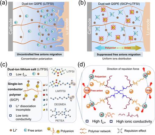 聚合物电解质因其良好的延展性、可加工性和界面接触性能等优点在固态锂金属电池的开发中引起广泛关注。然而,在传统的聚合物电解质中,由于锂离子与聚合物的路易斯碱位点的强力耦合,锂离子传输速率通常慢于对应的阴离子,锂离子迁移数(LTN)较低,而且无效的阴离子会在电极附近形成浓度梯度,这不可避免地会导致浓差极化的产生。此外,根据Chazalviel提出的空间电荷模型及阴离子迁移速率对锂枝晶生长的影响可知,界面处阴离子的消耗和移动速率会关系到锂枝晶的成核和生长。因此,减缓阴离子的移动速率和不均匀聚集是减缓浓差极化抑制锂枝晶生长的有效方法。
