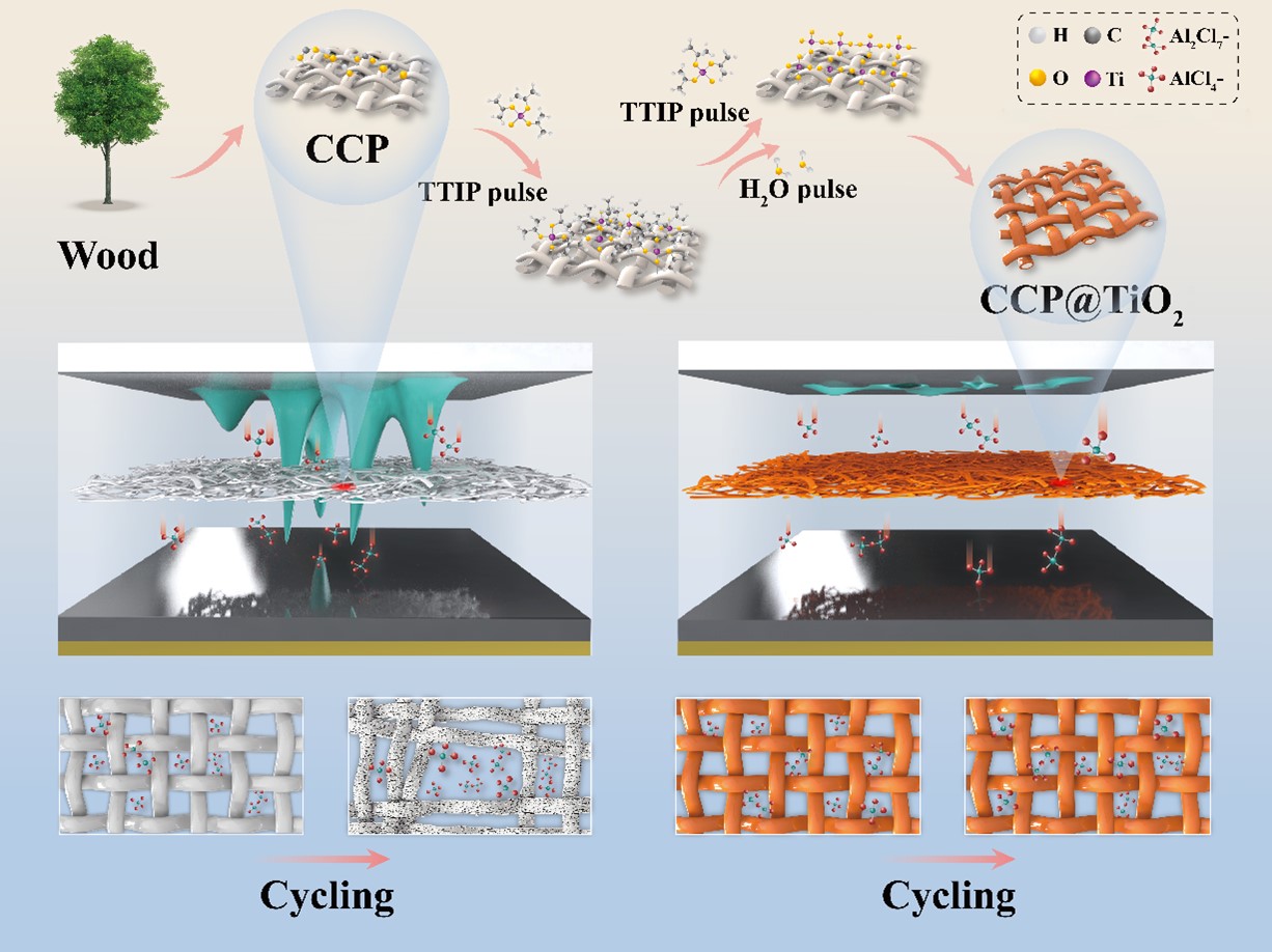 针对上述问题,西交大熊礼龙副教授团队提出了一种简单易行的策略,即将TiO2纳米层引入商用纤维素纸(CCP),来制备具有陶瓷涂层的纤维素基隔膜(CCP@TiO2),以解决纤维素在离子液体中的溶解性问题,从而提升其稳定性。通过结合实验与模拟的研究,CCP@TiO2隔膜展现出优异的抗溶解性能及界面极化效应,不仅提供了稳定的阴离子通量和高达0.29的阴离子迁移数,还促进了离子与电荷在隔膜/电解质/阳极界面的均匀分布,从而推动无枝晶的铝沉积。实验结果显示,在0.2 A g-1的循环条件下,组装的Al//石墨全电池经过1000圈循环后仍保持90.3 mAh g-1的放电比容量,而使用玻璃纤维(GF)隔膜的电池放电容量为82.4 mAh g-1。此外,回收利用的CCP@TiO2隔膜组装的电池依然保持98%的容量保持率。这种针对离子液体的抗溶解性与抑制枝晶生长的隔膜设计策略,不仅有望替代商业GF隔膜,也为RABs的稳定运行和可持续发展开辟了一条独特的途径。