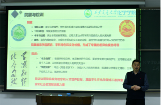 1931年建院历史为脉络,系统梳理了学科发展历程与育人成果,重点阐释了院徽中烧杯、1928年字样、书本与齿轮等核心元素的象征意义——既承载化学学科传统,又凸显理论与实践并重的办学理念。围绕"化合自然 学微知彰"的院训,丁书江强调新时代人才培养需立足学科交叉融合,鼓励师生将微观研究服务于国家战略需求。党课尾声,他通过展示杰出校友在科研攻关、产业报国中的先进事迹,激励青年学子厚植家国情怀,争做新时代化学领域的开拓者。