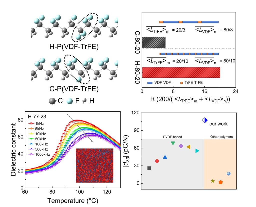 与直接共聚法制备的C-P(VDF-TrFE)中VDF和TrFE单元主要以头-尾(H-T)连接不同,H-P(VDF-TrFE)中的VDF和TrFE单元主要以头-头/尾-尾(H-H/T-T)的方式连接,且TrFE单元沿分子链随机分布。在这种H-H/T-T结构中,与TrFE相邻的VDF单元更倾向于形成旁氏(g)构象,而不是C-P(VDF-TrFE)中的反式(t)构象。这种差异导致在低TrFE含量下H-P(VDF-TrFE)表现出强弛豫特性(γ指数为1.75),而C-P(VDF-TrFE)在类似TrFE含量下表现出典型的铁电行为(γ指数为1.21)。此外,低的TrFE含量还使H-P(VDF-TrFE)保持了相对较高的Pr(5.2 μC/cm2),有利于产生更高的d33。更重要的是,当TrFE含量为23 mol%时,可以诱导H-P(VDF-TrFE)从all-trans构象转变为3/1 helix构象,表现出类似陶瓷的MPB行为。这项工作为制备高性能柔性压电聚合物提供了新的思考。