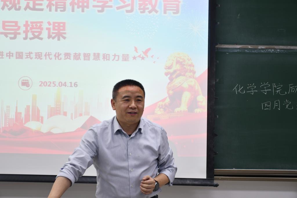 党委书记张志成教授以《新时代作风建设的历史逻辑与实践路径》为题讲授党课。他立足国际国内形势变化,从“逆全球化背景下单边主义抬头”“全球产业链深度调整”等宏观视角切入,系统回顾了党的十八大以来全面从严治党取得的标志性成果。结合《中国共产党纪律处分条例》具体条款,张志成以“三河市行政执法不规范”等典型案例为切入点,深入剖析形式主义、官僚主义的滋生根源与治理路径。他特别强调,化学学科师生需立足科研实际,将中央八项规定精神融入实验室安全管理、科研经费使用等日常场景,以严明纪律护航科技创新,为推进中国式现代化贡献专业力量。