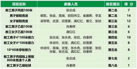 教工同样表现亮眼。张志成老师在教工男子丙组100米项目中以稳健发挥夺得第二名,肖春辉、张志成、张永亮、张侃老师领衔的教工男子4×100米接力凭借稳健的起跑与优异的速度斩获第四名。此外,郗凯、张淼、高瑞、欧阳炜艾、崔晨晖、李龙等老师组成的队伍在男子板鞋竞速项目中表现卓越,以出色的团队协作能力荣获第二名。赛场上,教职工们或奋勇冲刺、或咬牙坚持,每一滴汗水都诠释着化学人“精勤求学、追求卓越”的信念。