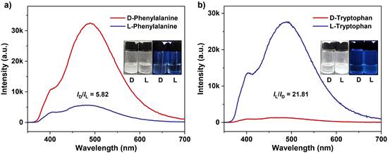 张彦峰教授、焦佼副教授联合济南大学聂永教授开发了一种高度立体选择性的手性碳硼烷衍生物的不对称合成方法。该方法采用商品化的起始材料,能够通过两步一锅法精确构建光学纯手性毗邻桥联碳硼烷衍生物,实现10克以上的规模化制备,且无需手性HPLC分离。在将共轭发色团引入该结构之后,获得了一系列性能优异的CPL活性分子。而且,将碳硼烷引入手性桥联结构中显著增强了发光化合物的ΦPL(最大提高30%)和glum(最大提高至9倍),这也是首次发现碳硼烷对化合物发光行为的“双提升”现象。应用其中一种手性发光化合物,在水相中实现了对几种氨基酸的良好对映选择性荧光识别。