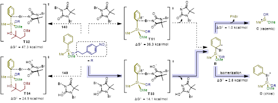机理研究发现,醇类分子与亲电性卤化试剂(如DBDMH)首先发生背景反应产生酸性条件,质子活化的DBDMH再与苯基硅烷发生亲电性卤化反应产生Wheland中间体。与经典的卤化脱硅反应机理不同,该机理研究中的Wheland中间体并不参与亲核取代反应,而是通过较低的能垒转化为硅阳离子和苯卤鎓离子(能垒仅1-3 kcal/mol)。
