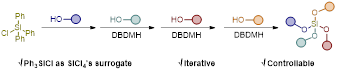 王优良教授团队首次实现了四种不同醇分子在单个硅中心原子上的逐步可控连接,成功制备了传统方法难以合成的含四种不同烷氧基的硅烷。研究团队创新性选用三苯基氯硅烷(Ph₃SiCl)作为四氯硅烷的合成等价体,以脱苯基醚化反应为关键反应,实现了亲电性卤化试剂对硅-苯键的精准切割与醇分子的可控连接。