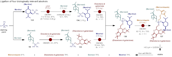 这项连接技术展现了广谱的底物适应性:从空间位阻巨大的全氟叔丁醇到生物活性分子薄荷醇,一系列结构迥异的一级、二级、三级醇类均可参与连接。特别值得一提的是,水不仅不再是反应障碍,反而成为优选溶剂——团队首次实现了在水介质中的醇羟基的硅醚保护反应,摆脱了使用氯硅烷进行醇羟基的保护反应对无水环境的严苛依赖。在概念验证中,团队仅用四步便完成药物分子的精准组装:将抗菌药甲硝唑、镇痛成分薄荷醇、天然产物冰片及糖分子通过硅原子三维集成。这种“分子乐高”构建的化合物在酸性条件下可解离回收各醇类模块。