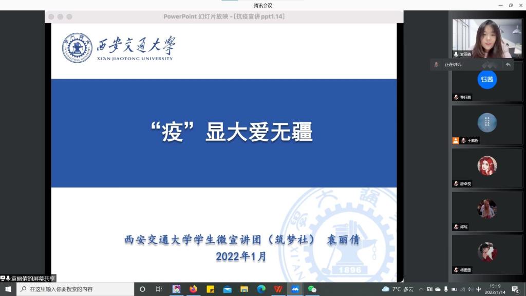 学生微宣讲团(筑梦社)社长,马克思主义学院袁丽倩进行“携手共抗疫,交大勇担当”主题宣讲。袁丽倩带领支部成员回忆了疫情出现以来志愿者们的辛劳和社会各界的倾力帮助。她借《抗击新冠肺炎疫情的中国行动》白皮书和《共产党宣言》强调了人民至上的重要性。通过袁丽倩精彩生动的讲述,支部成员们深刻体会到伟大的抗疫精神,以及身为交大学子所肩负的使命与担当。