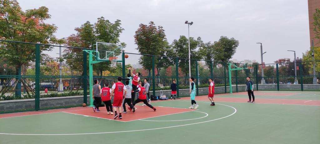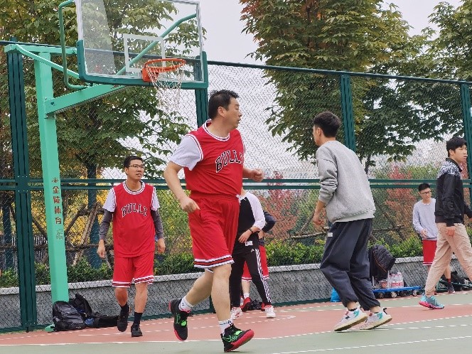 比赛以5V5篮球赛的形式展开,比赛全程分为上半场和下半场。参赛人员共计22名,其中参赛教师11名,分别是:肖春辉、洪涛、饶彬、胡明友、李静、梁仲帅、郭寅周、谭少博、丁书江、张彦峰、漆贺同等;参赛学生11名,分别是:苏宏哲、龚航、李宸辉、李卓、彭圣钧、王世新、王逸涵、王钰、王石、刘理民、王开腾等。赛前参赛队员们进行了充分的热身,比赛在裁判嘹亮的哨声中正式开始。高高抛起的篮球激起了大家的热情,比赛一开始参赛双方就迅速投入比赛,尽展赛场英姿。