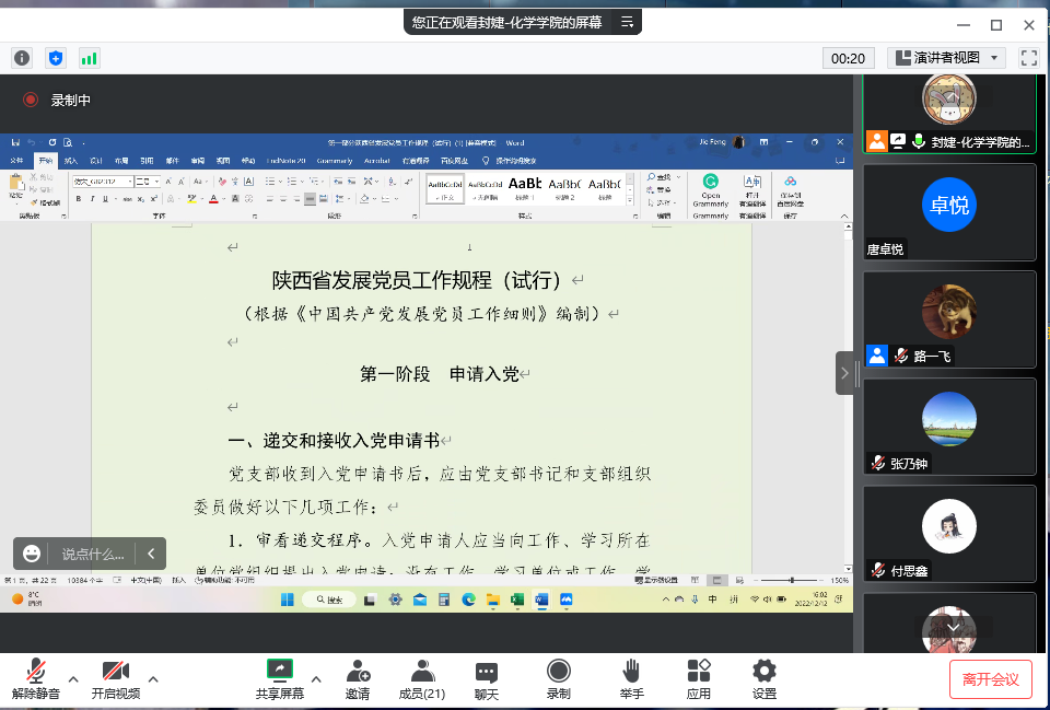 兼职辅导员封婕同学向大家解读了陕西省发展党员工作流程,封婕结合学校发展党员工作情况,从申请入党、入党积极分子阶段、发展对象阶段、预备党员的接收以及预备党员的转正五个方面对党支部学生干部的工作内容进行了详细介绍。分享结束后,法学院的学生干部们积极提问,大家进行了进一步的交流学习。活动最后,法学院的张乃钟老师指出党支部共建活动是促进两个支部共同进步的有效方式,理工科与文科的相互学习更能使党支部活动有新的发展与突破,同时她也提醒大家党支部工作是一个需要认真对待的事情,大家对待党支部的工作务必要严谨仔细。