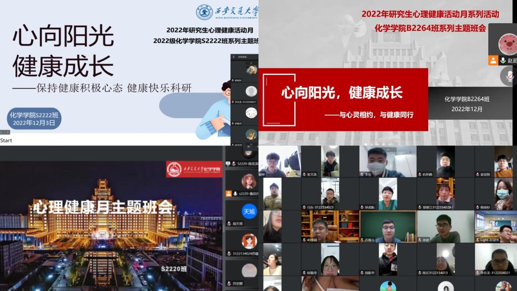 针对2022级新生硕士特举办主题为“心向阳光 健康成长”的主题班会。通过班级学生干部充分发挥朋辈互助的优势,以达到宣传心理健康知识,倡导健康生活方式,提高学生心理保健能力的目的。本次线上+线下主题班会累计120余人参加,班会结束后,各新生班级心理委员及时组织本班同学进行活动总结,班内学生积极发表关于心理健康的认知和看法,达到了良好的宣传目的。