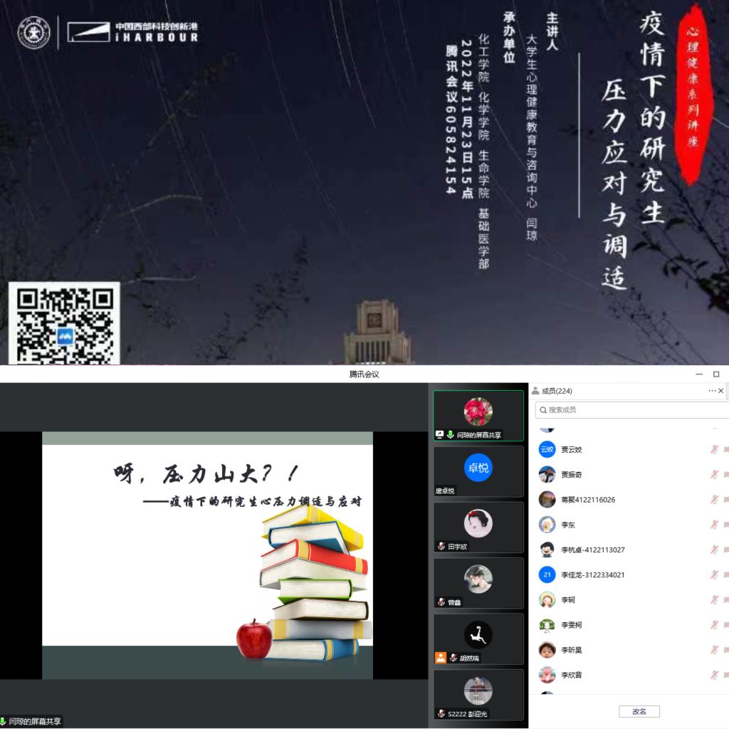 联合化工学院、生命学院、基础医学院邀请了大学生心理健康教育与咨询中心闫琼老师于2022年11月23日开展了主题为“疫情下的研究生压力应对与调适”的讲座。本次讲座累计有402人参会,达到了良好的心理健康教育效果。
