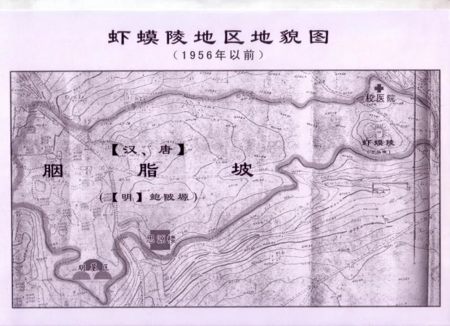 1956年,交通大学西迁,在唐兴庆宫遗址南面选定了校址。在校址图上,还可以清晰地看出迁校前夕校园的地貌概况:在校园东南区有一东西宽约600米、南北长约240米的小塬高坡地,这就是古时的“胭脂坡”。在塬东端有一土堆,海拔高度为437.69米。这当是昔日的“虾蟆陵”。今天,交大校医院以及新建的浴池就位于这一古址的周侧。在这坡地北沿有一条大沟,自南沙坡村口斜向西北方的乐居场村。其沟岸陡峭,沟宽40-80米,深5-10米,沟底有行车和人行小道。今天,交大钱学森图书馆主楼便坐落在这一沟道之中,其沟当年地势风貌还依稀可辨。