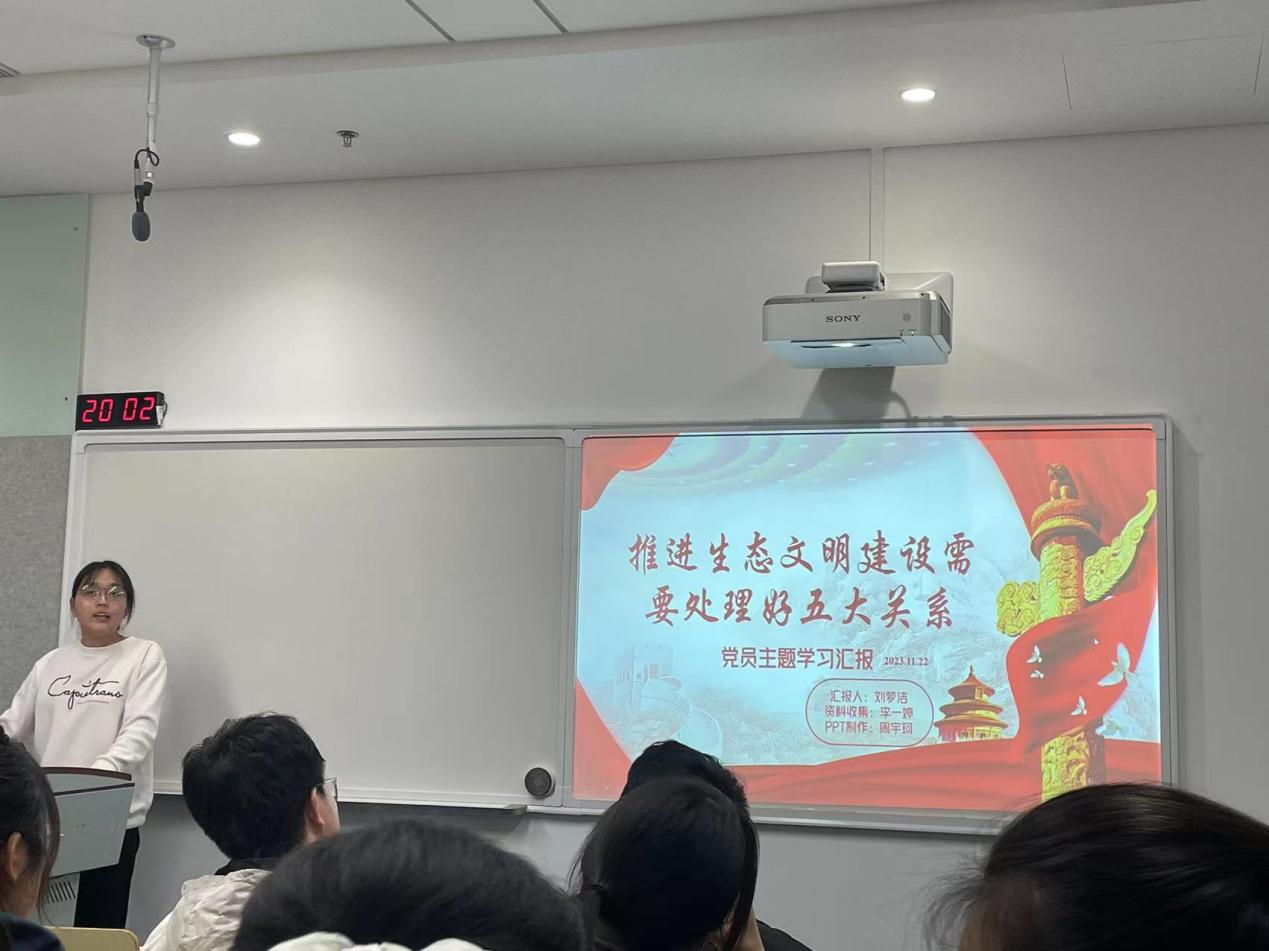 刘梦洁同志代表小组成员进行主题为《推进生态文明建设需要处理好五大关系》的汇报,带领党员同志深入学习了解“五大关系”的内涵和精神,号召全体党员通过自己的力量积极参与生态文明建设,促进发展的同时保护环境。通过习近平总书记在江西考察的例子从五个方面深入学习。重点攻坚和协同治理强调的是正确认识和处理优先重点解决突出生态环境问题与协同推进自然生态系统一体化保护治理。自然恢复和人工修复强调的是正确认识和处理生态文明建设过程中弘扬发挥人类活动主体能动性与遵循尊重自然生态规律。外部约束和内生动力强调的是正确认识和处理生态环境保护治理或生态文明建设过程中法律制度环境约束作用和社会主体认知行动自觉。