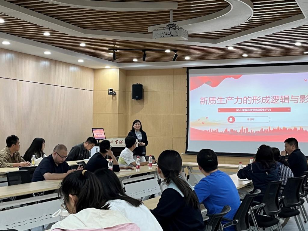 副院长李银环老师为党员同志讲党课,课程主题为“新质生产力的形成逻辑与影响”。李银环老师讲述了新质生产力的重大意义,基本特点,形成逻辑以及重大影响,不仅剖析了新质生产力的深刻内涵,而且为师生党员响应新质生产力的发展提出要求。